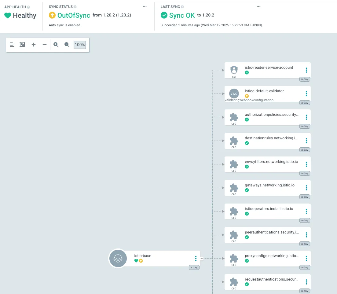 ArgoCD의 Application 리소스를 배포해 Grafana와 Istio 등 EKS 클러스터 운영에 필요한 각종 애플리케이션을 배포하다가 거슬리는 부분을 발견했다. 아래처럼 특정 리소스가 지속적으로 실제 EKS 환경의 리소스와 소스코드 저장소 상 구성의 차이점이 있어 Sync status가 계속해서 Out of Sync인 상태로 남는 현상이 발생했던 것.
