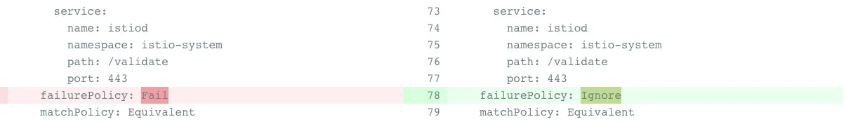 뭔가 문제가 있는건 아닐까 하고 찾아보다 보니, Istio 프로젝트에서 ValidatingWebhookConfiguration 매니페스트에서 배포 시에는 failurePolicy가 Ignore로 설정되지만 웹훅 엔드포인트가 ready 상태가 되면 failurePolicy가 Fail로 업데이트 된다는 내용이 있었다. 즉, Git 저장소의 구성 값과 실제 운영 시의 구성 값이 차이가 나는 것이 정상 동작인 것이었다.