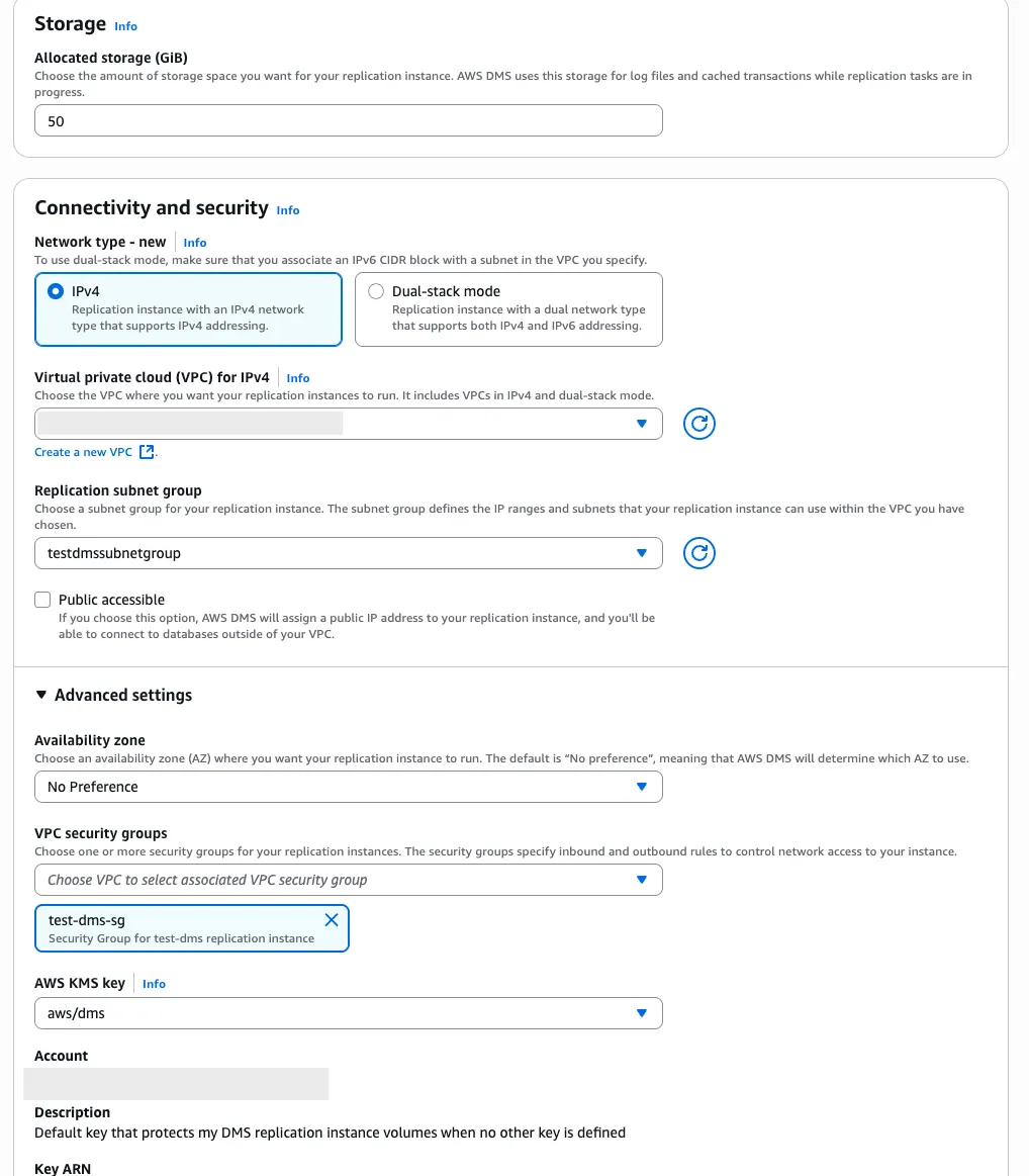- replication subnet group: 위에서 생성한 DMS subnet group을 선택