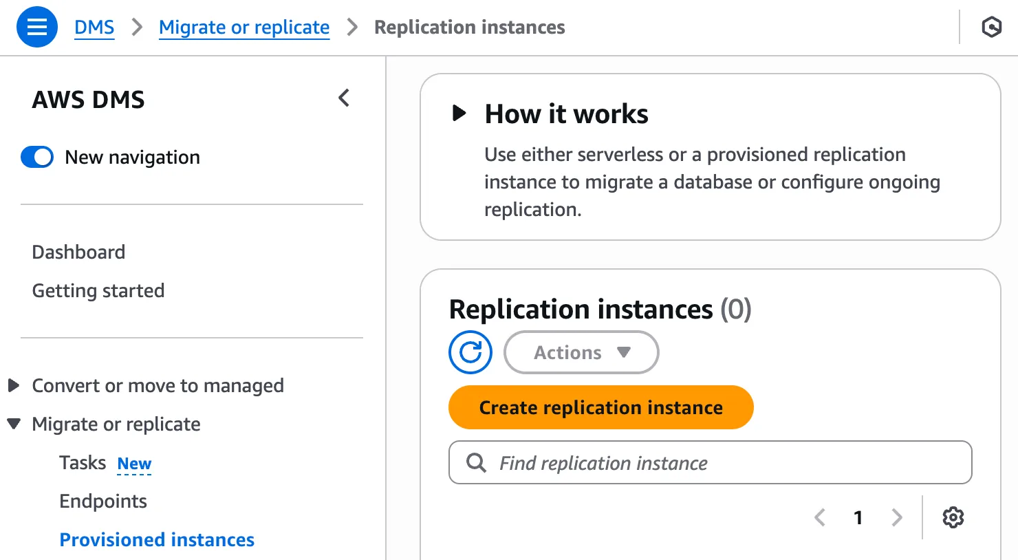 4. DMS task를 생성하기 위해 복제 인스턴스(replication instance)를 생성한다. AWS DMS > Migrate or replicate > Provisioned instances > Create replication instance를 클릭한다.