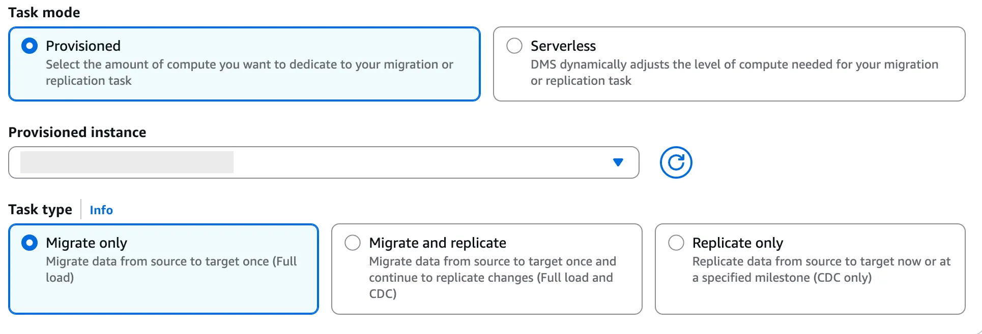 - Task mode: Provisioned 선택 및 위에서 생성한 인스턴스 선택
