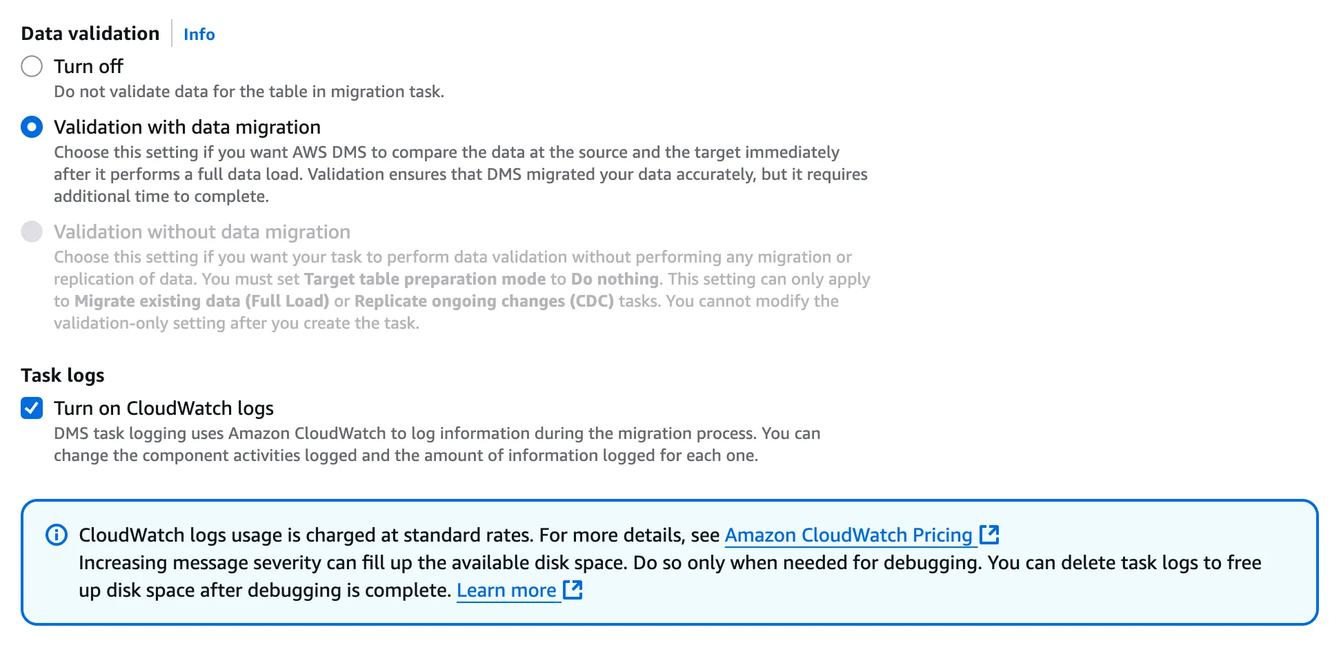 - Validate if table has primary key or unique index when DMS validation is enabled: CDC 작업의 유효성 검사 시 문제가 되는 부분으로 크게 신경쓰지 않아도 되어서 따로 조치를 취하지는 않았다.