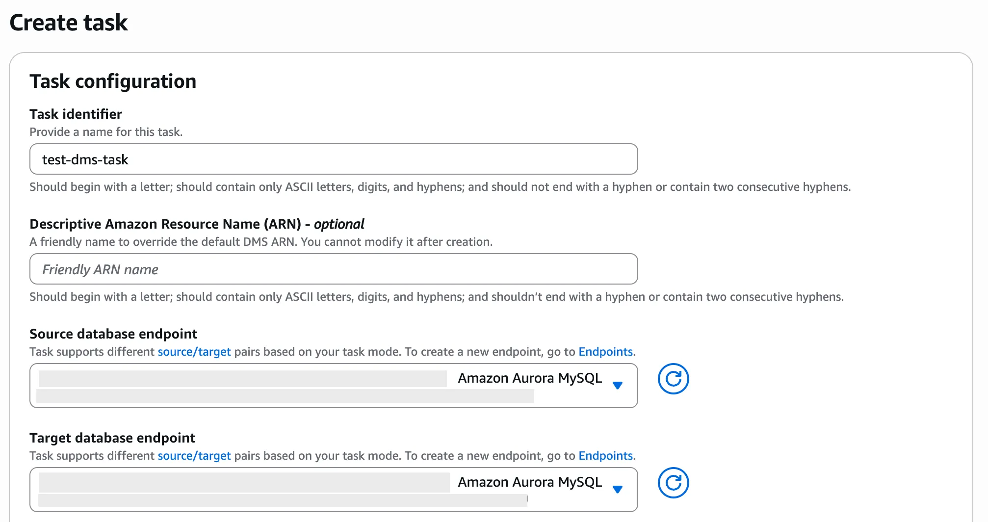 - Task identifier: test-dms-task 등 적절한 이름으로 설정