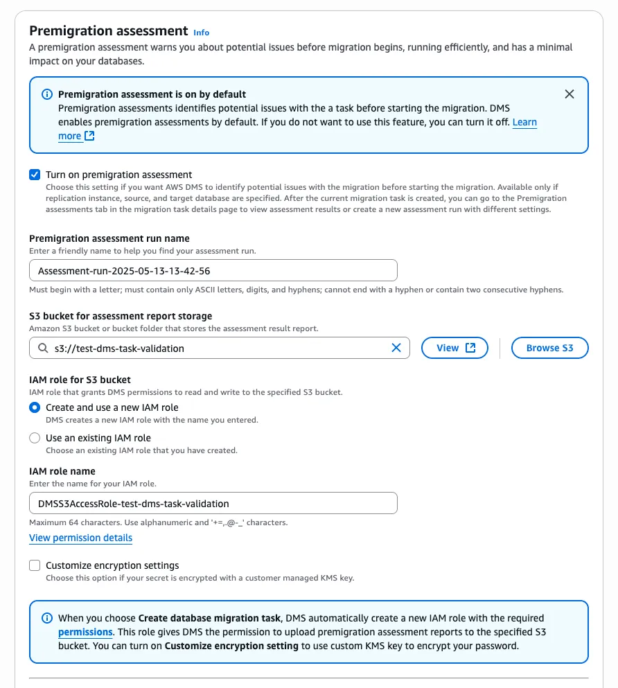 - Premigration assessment 항목에서는 Turn on premigration assessment를 활성화하고 결과를 저장할 S3 및 IAM Role을 구성