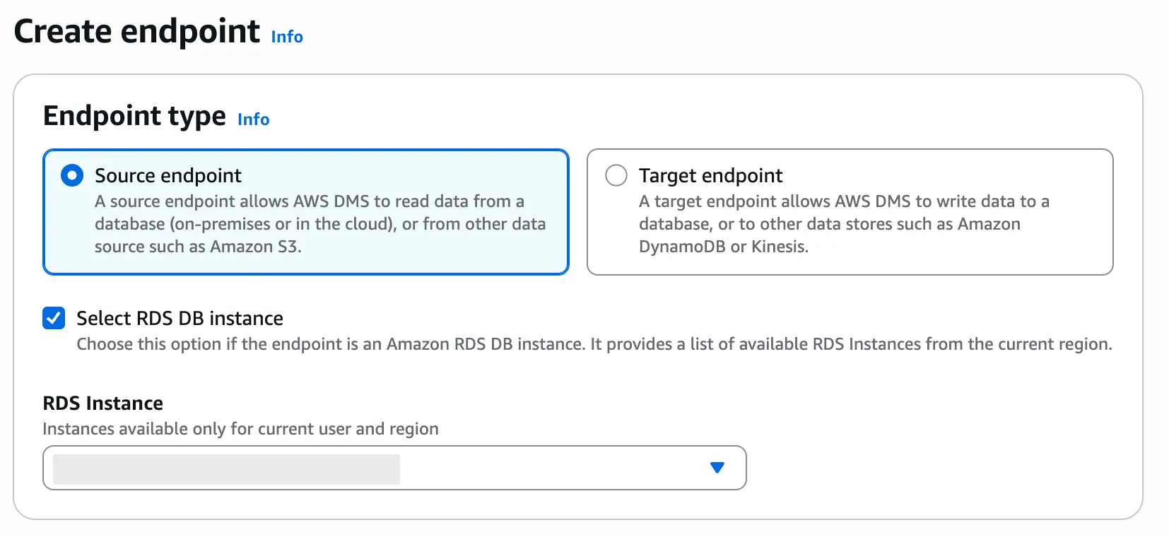 7. Source DB와의 연결을 위해 Source Endpoint를 생성한다. AWS DMS > Migrate or replicate > Endpoints에서 Create endpoint를 클릭한다. Endpoint Type은 Source endpoint로 설정하고 Select RDS DB instance를 선택해 복제할 RDS 인스턴스 정보를 불러온다.