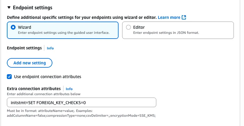 10. Target Endpoint도 위와 동일한 요령으로 생성하되, targetDB의 정보를 입력해준다. 그 다음 추가로 설정해줄 점이 있는데, Endpoint settings라는 토글을 열고, Use endpoint connection attributes를 체크한다. 그 다음 아래 값을 Extra connection attributes에 입력해 FK 제약 조건 관련 에러를 방지한다.