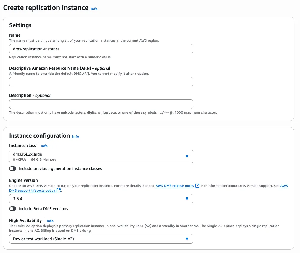 - High Availability: Single-AZ(빠르게 full load만 하고 종료할거기도 하고 문제가 생기면 재로드하면 되기 때문)