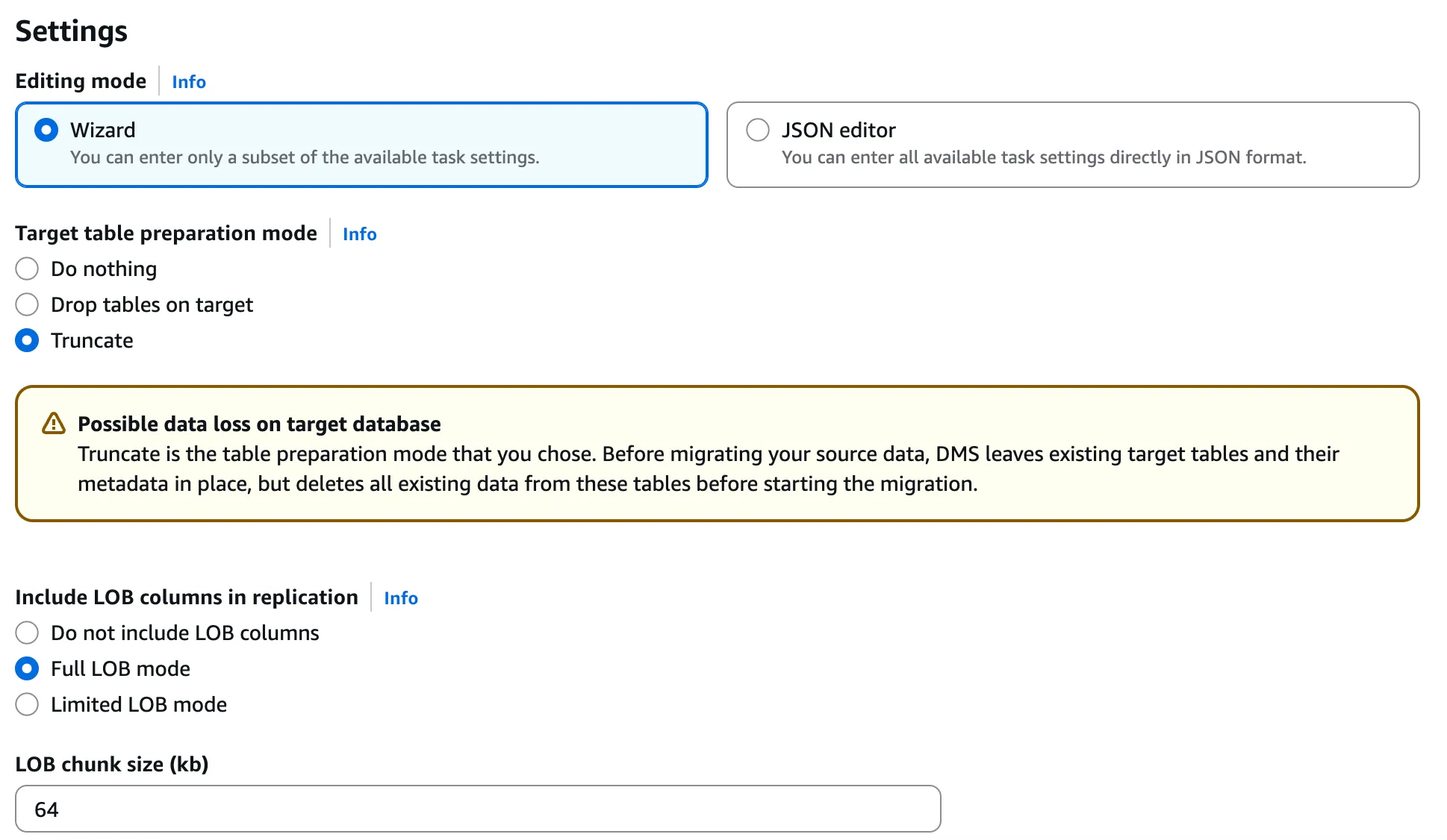 - LOB column settings: Full LOB mode (blob 데이터 컬럼이 있을 경우 해당 설정을 하지 않으면 데이터가 중간에 잘려서 에러 발생할 수 있음)