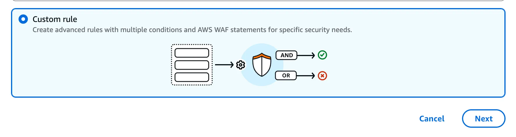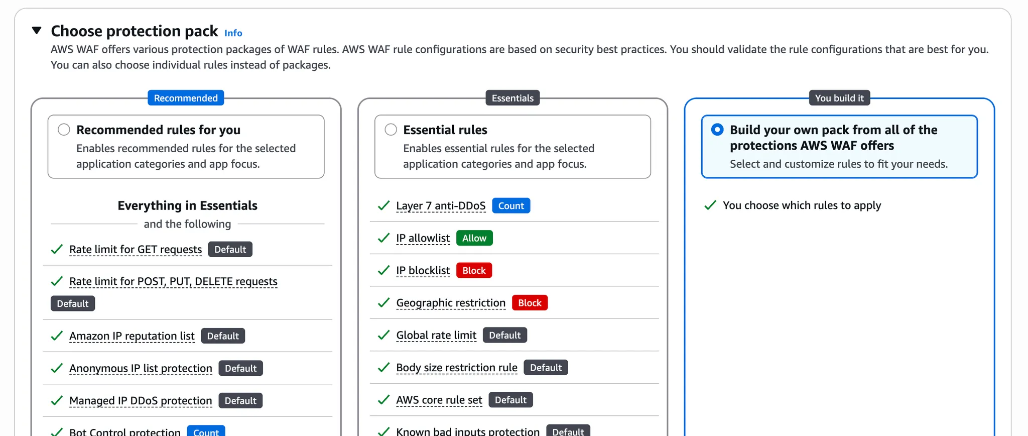 3. Build your own pack from all of the protections AWS WAF offers를 클릭한다(추천하는 룰셋 사용할 경우 해당하는 옵션 선택).