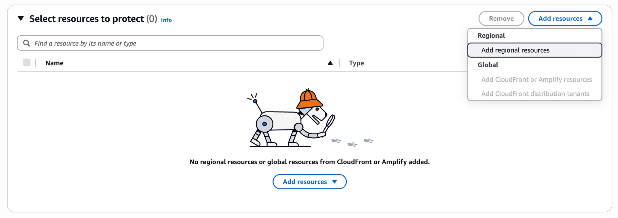 2. Add resources에서 Add regional resources를 클릭하고, WAF를 연결할 리소스(ex. ALB)를 선택한다.