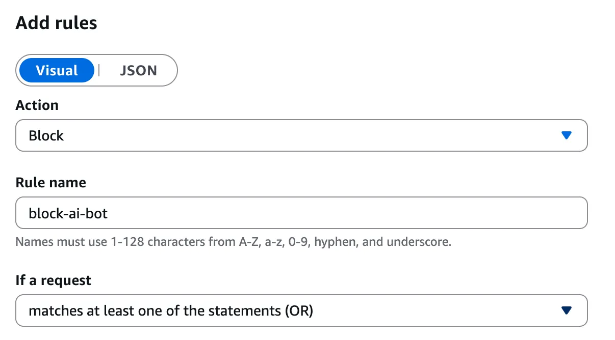 LLM 학습용 봇은 보통 해당 플랫폼 공식 문서에 유형, 그리고 원하지 않을 경우 크롤링이 되지 않도록 하는 robots.txt 설정 가이드가 나와있다. 하지만 위에서도 언급했듯 해당 설정을 무시하고 크롤링 하는 케이스가 있어 이번 경우에는 AWS WAF를 통해 크롤링 트래픽을 차단했다.