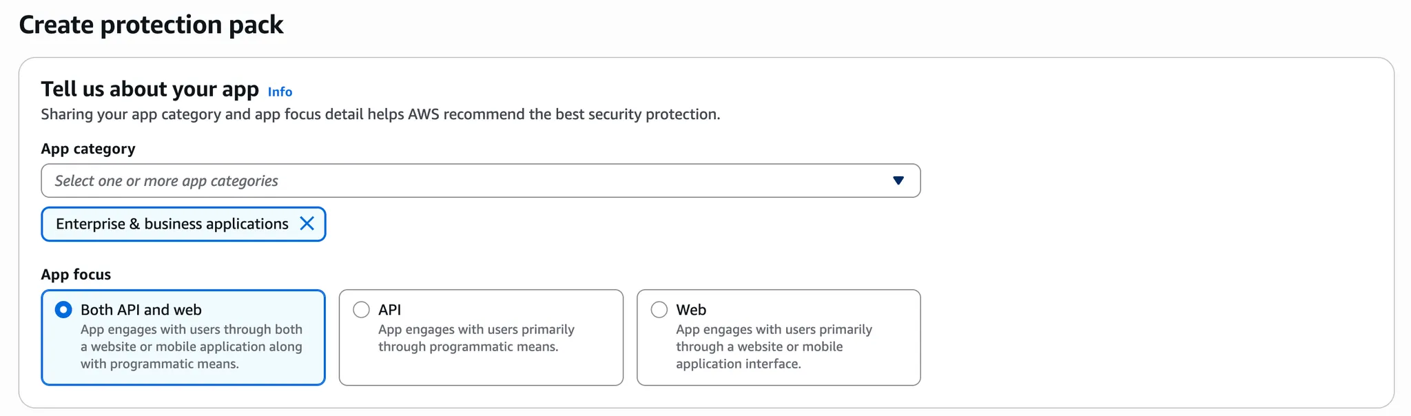 1. AWS 콘솔에서 WAF > Create protection pack을 선택한다(이전 버전의 WAF 콘솔이라면 Create ACL). App Category는 적당히 선택한다.