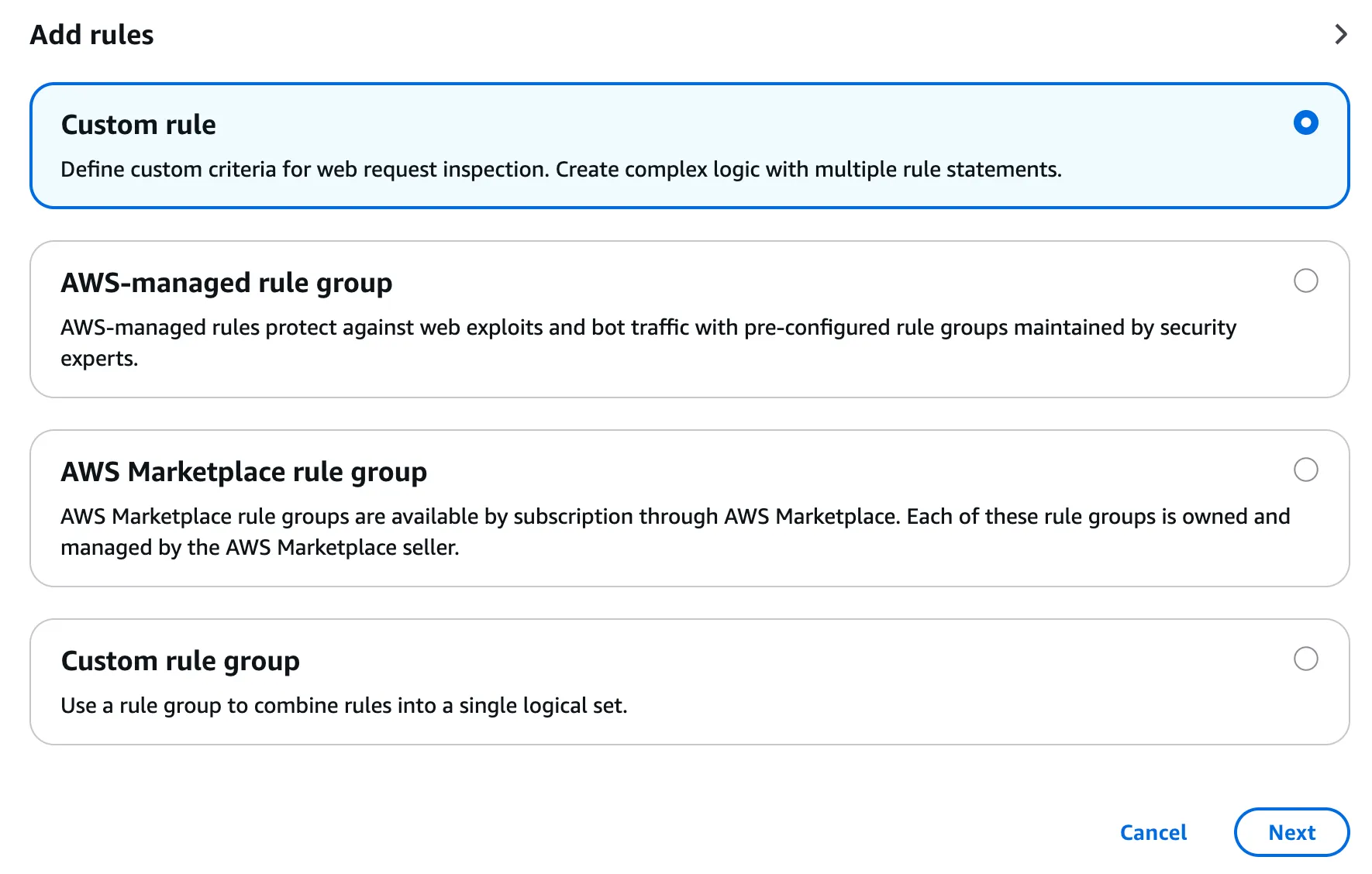 4. Add rules 에서 Custom rule을 선택하고 Next를 클릭한다.