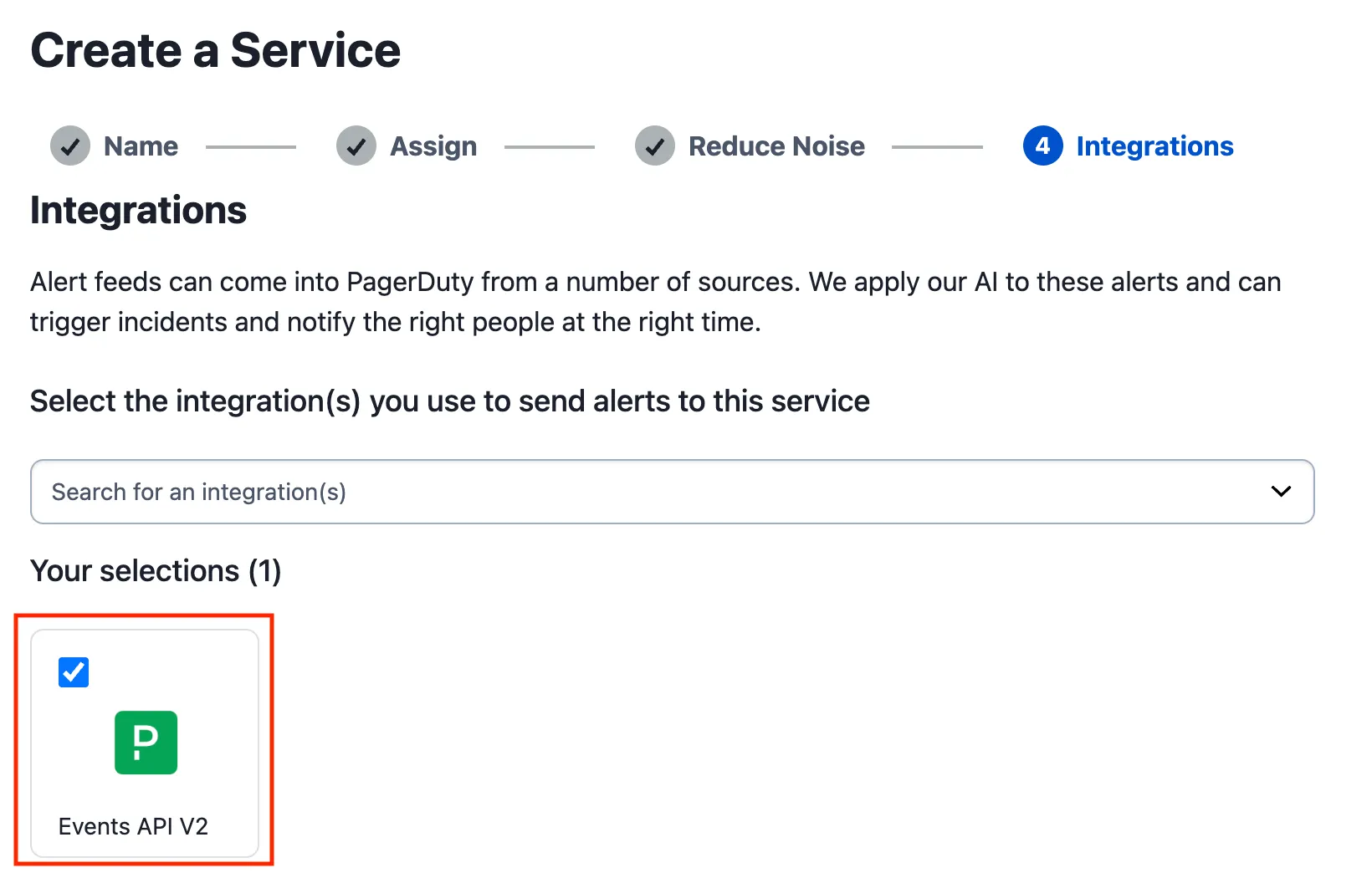 7. Integration에서 Events API V2를 선택하고 Service를 생성한다.