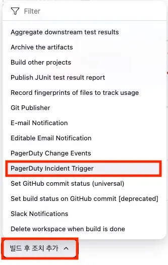 스크롤 다운 후 빌드 후 조치 영역에서 빌드 후 조치 추가 버튼을 클릭 > PagerDuty Incident Trigger를 선택한다.