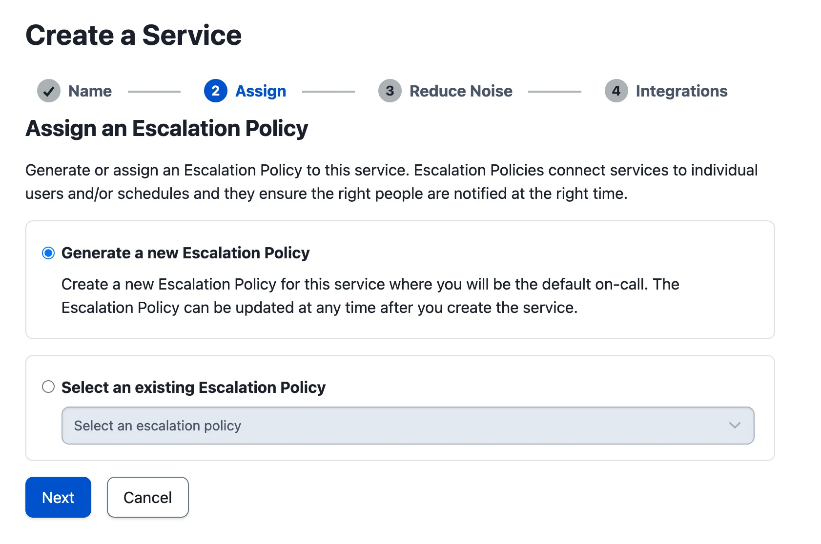 6. (서비스를 신규 생성하는 경우) 적절한 Escalation Policy를 신규 생성하거나 기존 Escalation Policy를 선택한다.