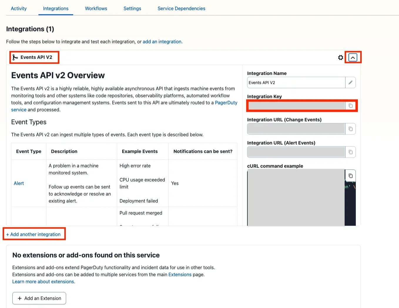 8. 생성한 서비스 이름을 클릭하고, Integrations 탭에서 Events API V2가 추가 되어있다면 드롭다운을 클릭하고, 없다면 Add another integration에서 Events API V2 를 추가한다. 그리고 Integration Key를 복사한다.