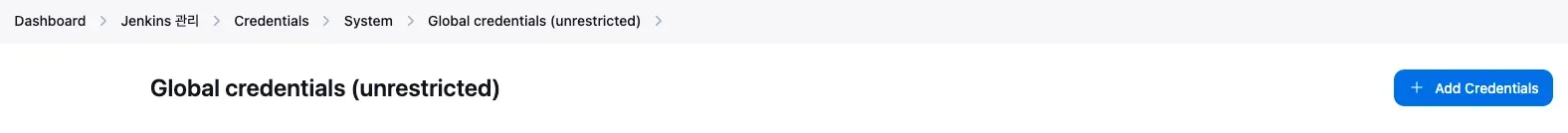 9. 다시 Jenkins로 돌아가 Jenkins 관리 > Credentials > Global 도메인을 선택한 후 Add Credentials를 클릭한다.
