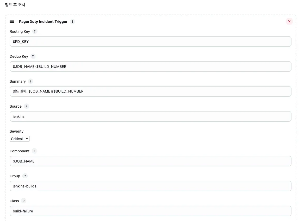 아래와 같이 Routing Key($PD_KEY 환경변수 사용) 및 필요한 필드를 설정한다($JOB_NAME 등의 환경변수는 젠킨스에서 기본으로 제공됨).