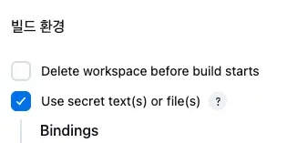 12. 만약 Pipeline타입이 아닌 Freestyle 타입의 프로젝트일 경우 파이프라인에서 구성을 클릭 > 빌드 환경 영역에서 Use secret text(s) or file(s) 체크박스를 활성화한다.