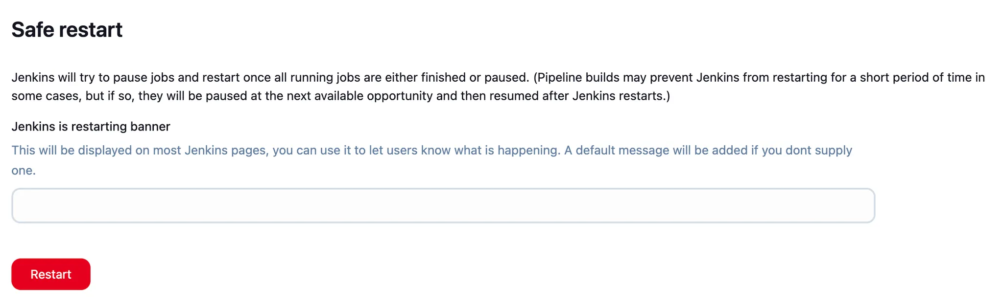 2. 플러그인을 선택하면 활성화를 위해 Jenkins를 재시작해야 한다. 브라우저에서 "<jenkins URL>/safeRestart"로 접근해 안내 배너에 띄울 문구를 입력하고 Restart 버튼을 클릭해 실행중인 job이 모두 정지되거나 종료되었을 때 재시작될 수 있도록 한다.