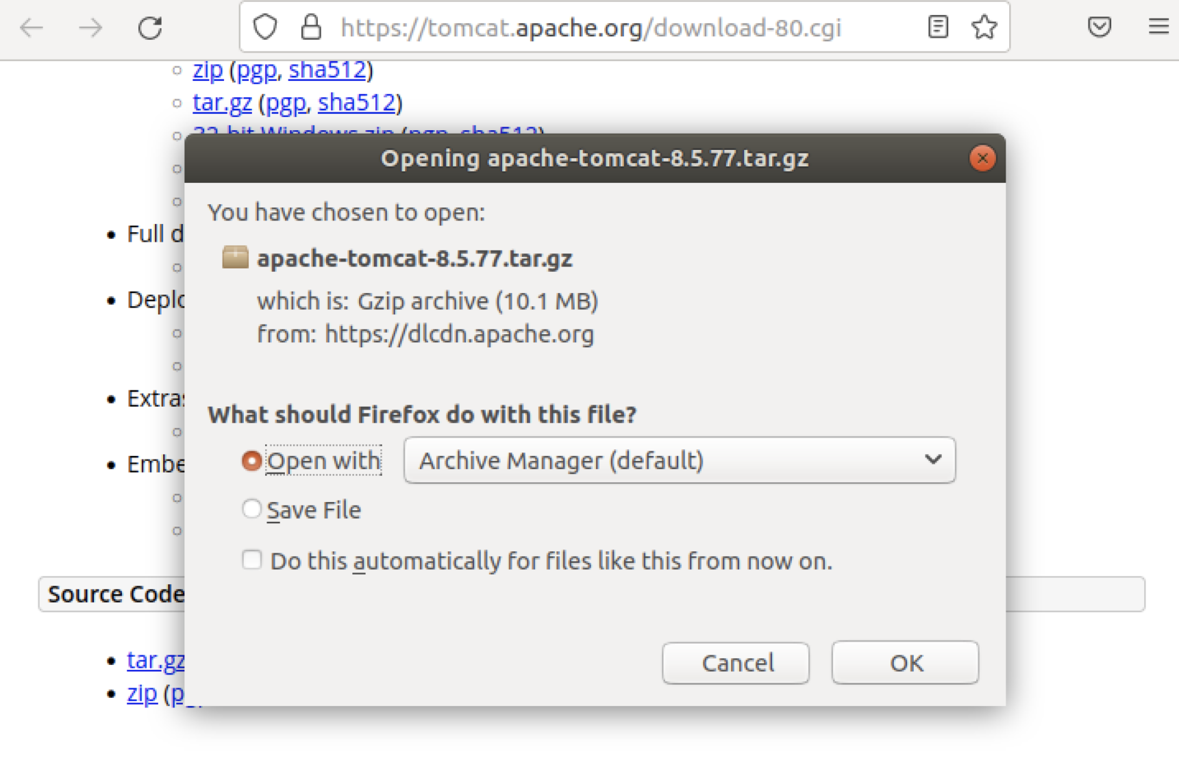 1. Tomcat 공식 웹사이트(https://tomcat.apache.org/download-80-cgi)에서 tar 파일을 다운로드한다.