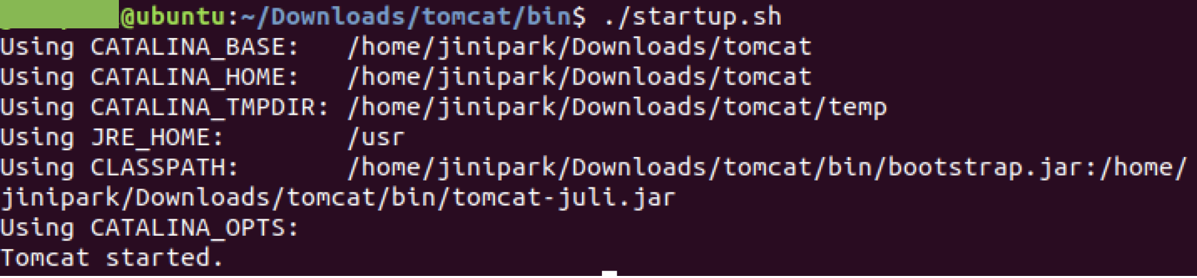 6. './startup.sh'를 입력해 해당 쉘 파일을 구동하면 tomcat 이 구동된다.