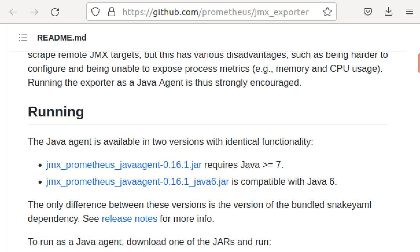 1. JMX exporter 깃헙 레포지토리(github.com/prometheus/jmx-exporter)에서 javaagent 파일을 다운로드한다.