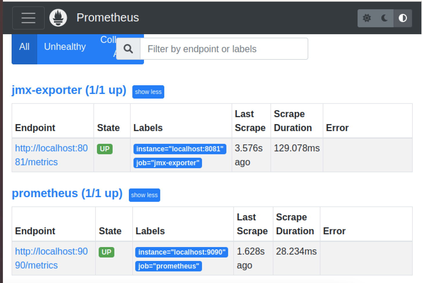 8. JMX-exporter 와의 연동 확인(1) status-Targets 메뉴로 이동해 각 job의 status가 UP 상태인지 확인한다.
