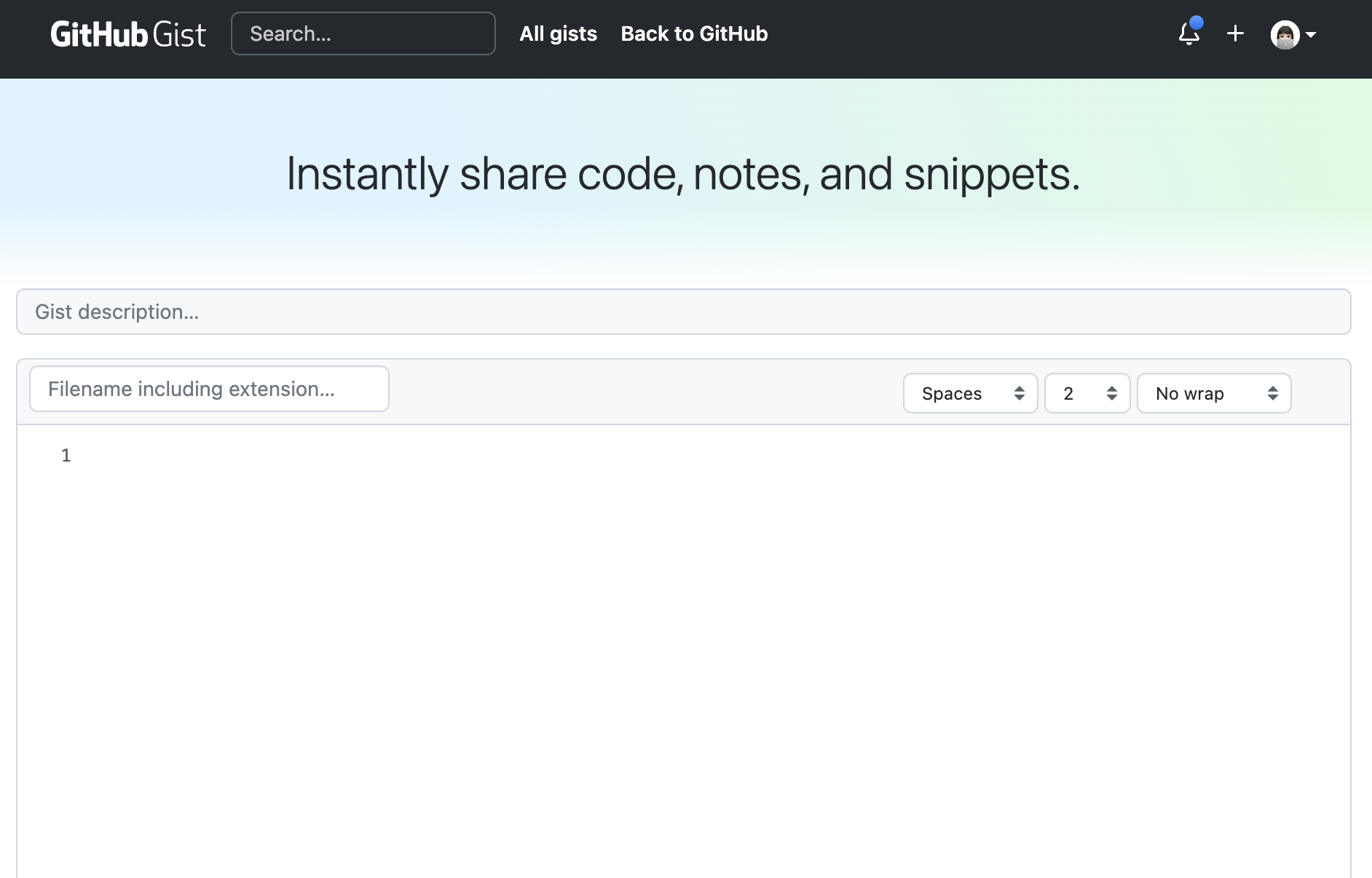 Github Gist를 사용하려면 먼저 Github에 로그인해야 한다. 로그인을 한 뒤 접속해보면 아래와 같은 화면을 볼 수 있다.