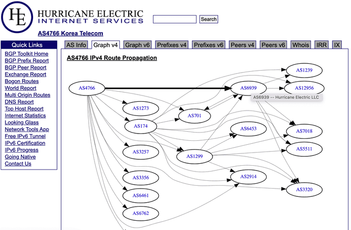 첫 번째 방법은 Hurricane Electric이라는 미국의 Tier 1 인터넷 사업자가 운영하는 BGP Toolkit 사이트를 활용하는 것이다.