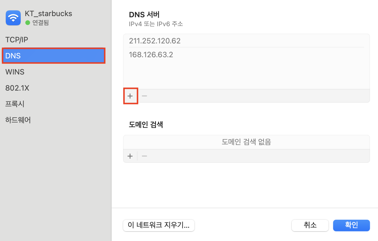 3. 왼쪽 탭에서 DNS를 선택하고, + 버튼을 클릭한다.