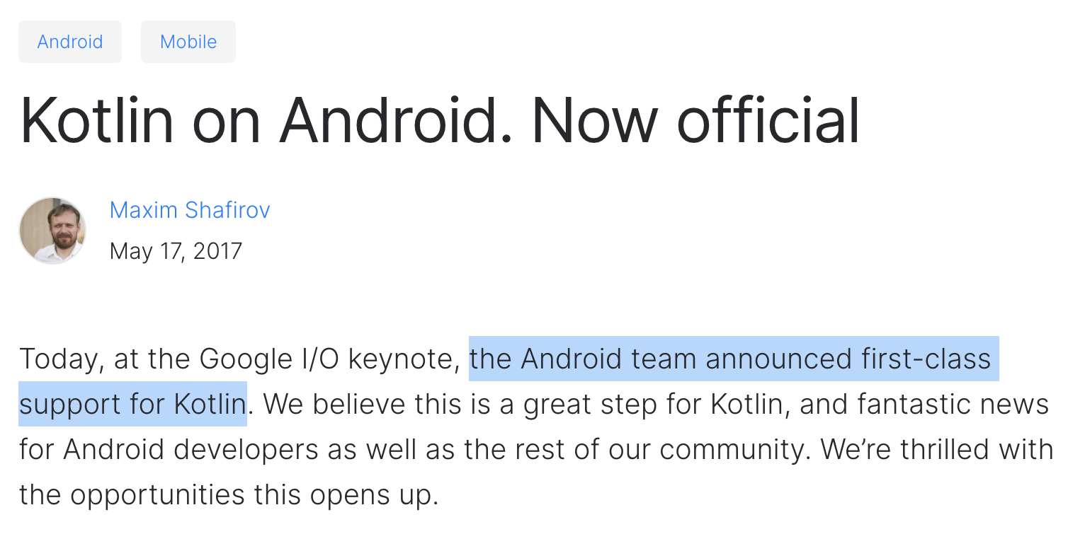 구글이 키노트에서 안드로이드 팀에서 코틀린을 최우선 지원(공식 지원) 하기로 발표했기 때문. 심지어 19년도에는 구글이 코틀린을 안드로이드 개발을 위한 메인 언어로 지정하게 되면서 안드로이드 네이티브 앱 개발자에게는 필요 불가결한 프로그래밍 언어가 되었다. 현재는 안드로이드 공식문서의 예제 코드도 코틀린으로 제공되고 있다.